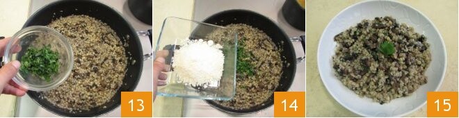 et mélangez avec du persil frais haché 13 et du fromage râpé 14. Servez la fregola aux champignons portobello bien chaude 15.