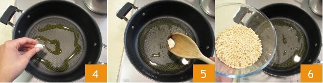 Dans une grande poêle, chauffez l'huile, ajoutez la gousse d'ail et laissez-la dorer à feu doux pendant quelques minutes pour parfumer l'huile 4, puis retirez-la 5 et ajoutez la fregola 6.