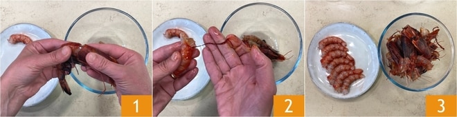 Pour réaliser la fregola aux crevettes, stracciatella et réglisse, commencez par nettoyer les crevettes rouges : détachez la tête du corps 1 et gardez les têtes. Retirez la carapace, la queue et les pattes, puis incisez le dos avec la pointe d'un couteau et enlevez l'intestin 2. Placez les crevettes nettoyées au réfrigérateur et réservez les têtes 3.