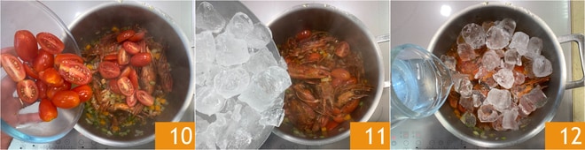 À ce stade, ajoutez les tomates cerises coupées en deux 10 et mélangez. Versez la glace 11 et couvrez avec de l'eau 12.