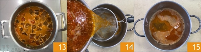 Réduisez le feu et laissez cuire pendant 40 minutes 13. Après ce temps, filtrez le bouillon 14 et gardez le liquide obtenu au chaud 15.