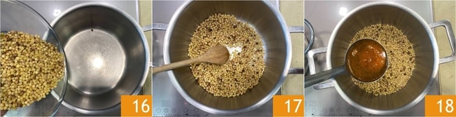 Versez la fregola dans une casserole 16 et faites-la griller à sec en remuant continuellement 17. Lorsque vous sentez au toucher que la fregola est chaude, ajoutez une louche de fumet 18. Continuez la cuisson de cette manière, en attendant que le liquide soit absorbé avant d'en verser davantage ; il faudra environ 12 minutes.