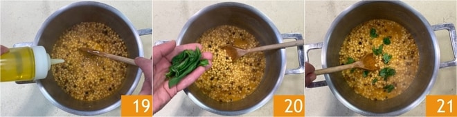 Une fois la fregola cuite, éteignez le feu et mélangez avec un filet d'huile 19, puis parfumez avec quelques feuilles de basilic émiettées à la main 20. Mélangez bien 21.