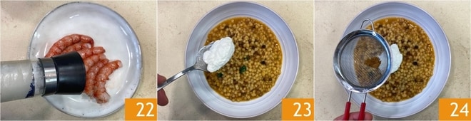 Laissez reposer la fregola et, entre-temps, assaisonnez les crevettes crues avec de l'huile et du sel 22. Vous êtes prêts à dresser : garnissez la fregola avec une touffe de stracciatella 23, puis saupoudrez de poudre de réglisse 24.