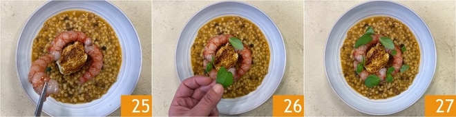 Enfin, ajoutez les crevettes crues 25 et quelques feuilles de basilic 26. Votre fregola aux crevettes, stracciatella et réglisse est prête à être servie 27 !