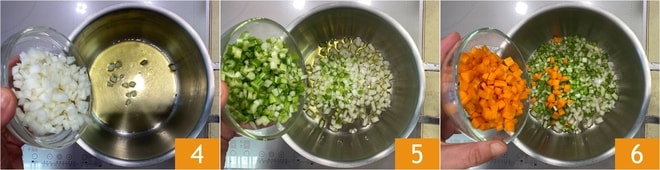 Passez au fond de cuisson : chauffez un filet d'huile dans une casserole, puis ajoutez l'oignon 4, le céleri 5 et les carottes 6 que vous aurez grossièrement coupés en morceaux au préalable.