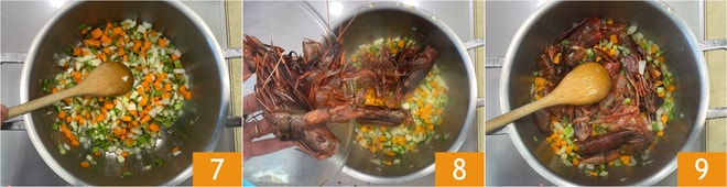 Faites revenir les légumes en remuant souvent 7, puis ajoutez les têtes de crevettes 8. Continuez de faire revenir quelques minutes en écrasant les têtes avec la louche pour faire sortir tous les jus 9.
