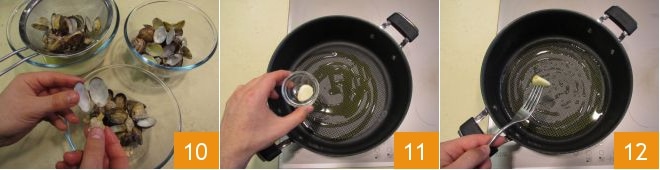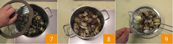 et couvrez avec le couvercle 7. Augmentez la température au maximum et laissez-les s'ouvrir pendant 4-5 minutes en agitant de temps en temps la casserole 8. Une fois prêtes, égouttez-les en les filtrant dans une passoire à mailles fines, ou éventuellement à travers une gaze stérile, pour éliminer d'éventuels résidus de sable ou de coquillages. Dès que vous remarquez la gousse d'ail, écartez-la 9.