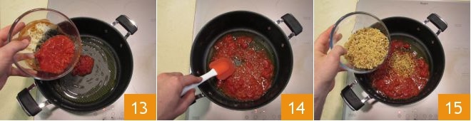 et plongez les tomates pelées finement hachées 13. Laissez infuser à feu moyen pendant quelques minutes 14 puis ajoutez la fregola 15.