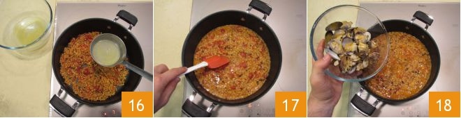 Remuez et arrosez, comme on le fait pour le riz, en ajoutant le liquide de cuisson des palourdes une louche à la fois 16. Si le liquide ne suffit pas, ajoutez de l'eau tiède ou du bouillon de légumes. Ajustez le sel et le poivre, puis mélangez 17. Quand il reste une minute pour la fin de la cuisson, ajoutez les palourdes et mélangez 18.