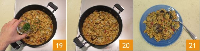 Enfin, éteignez le feu et ajoutez le persil haché 19. Voilà, votre fregola aux palourdes est prête, il ne vous reste plus qu'à mélanger encore 20, dresser et garnir avec une pincée de poivre 21 !