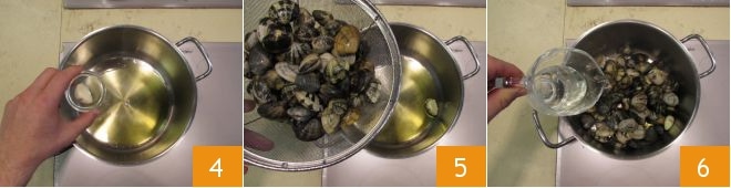 Déplacez-vous aux fourneaux et mettez une grande casserole sur le feu. Chauffez un filet d'huile et une gousse d'ail épluchée 4, puis plongez les palourdes 5, arrosez avec le vin blanc 6