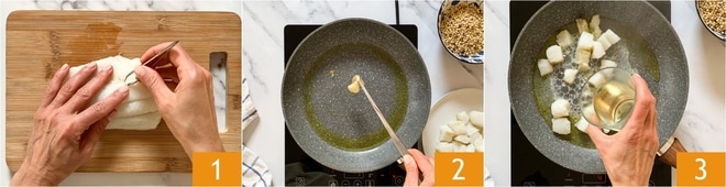 Pour réaliser la fregola avec morue, commencez par prendre la morue déjà dessalée et éliminez les arêtes 1, puis coupez-la en morceaux. Écrasez une gousse d'ail et faites-la dorer dans une poêle avec 20 g d'huile 2, puis retirez-la. Ajoutez la morue dans la poêle et déglacez avec le vin blanc 3.