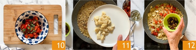 Lavez et coupez les tomates cerises en quartiers, assaisonnez-les avec 20 g d'huile, du sel, de la marjolaine et du thym 10. Après 12 minutes de cuisson de la fregola, ajoutez la morue 11, les tomates cerises, les câpres et les olives, laissez les saveurs se mélanger une minute 12, goûtez et ajustez le sel si nécessaire. Complétez avec du piment selon votre goût, un filet d'huile et un zeste de citron râpé. La fregola avec morue est prête à être dégustée.