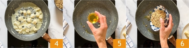 Laissez cuire 7 minutes, puis mettez de côté 4. Dans la même poêle, versez encore 20 g d'huile 5, faites chauffer légèrement, puis ajoutez la fregola 6.