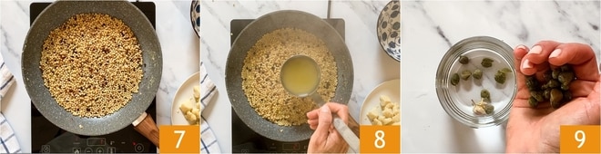 Faites griller 7 et continuez la cuisson comme s'il s'agissait d'un risotto, c'est-à-dire en versant le bouillon de légumes chaud selon les besoins jusqu'à couvrir 8, en le laissant être absorbé avant d'en ajouter davantage. Vérifiez la cuisson de la fregola après 12 minutes. Faites tremper les câpres dans de l'eau tiède 9 après les avoir bien rincés sous l'eau afin de les dessaler.