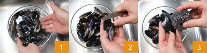 Pour préparer la fregola avec potiron et moules, commencez par nettoyer les moules. Tout d'abord, lavez-les sous l'eau courante 1 ; puis, avec le dos d'un couteau, éliminez les incrustations sur la coquille 2 et à la main, enlevez le byssus, la barbe qui sort des moules. Ensuite, à l'aide d'une tampon à récurer, nettoyez bien la coquille 3, en les passant progressivement sous l'eau. Mettez de côté les moules un moment et occupez-vous du potiron.
