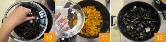 et couvrez avec un couvercle et laissez les coquilles s'ouvrir 10. Une fois que le potiron sera bien doré, versez 100 g d'eau 11 et faites cuire à feu moyen pendant une dizaine de minutes. En attendant, dès que les moules se seront ouvertes 12,