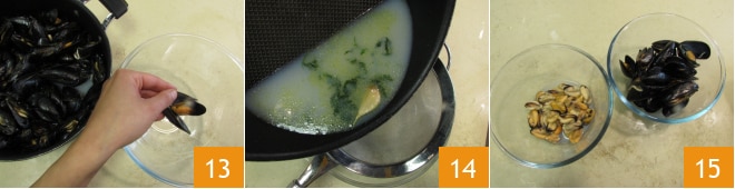 transférez-les dans un bol 13, en laissant l'eau de cuisson dans la casserole, que vous devrez ensuite filtrer 14 et garder au chaud. À ce stade, séparez les moules des coquilles, en faisant attention de ne pas vous brûler, et en en laissant quelques-unes entières pour la décoration finale 15.