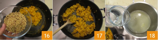 À ce stade, retirez la gousse d'ail du potiron, versez la fregola 16 et laissez-la griller 17. Versez l'eau de cuisson des moules dans une petite casserole et ajoutez 300 g d'eau. Mettez le tout sur le feu pour chauffer 18.