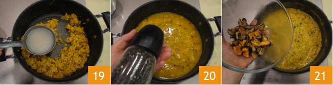 Après quelques minutes, ajoutez la première louche de bouillon de moules 19 et poursuivez la cuisson en ajoutant plus de bouillon seulement si nécessaire et en ajustant la quantité selon la consistance de la préparation. Salez, poivrez 20 et mélangez souvent. Cela prendra environ 20 minutes. Lorsque la fregola sera cuite, ajoutez les moules 21.