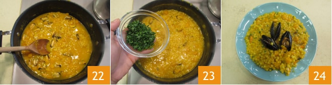 Remuez 22 et assaisonnez avec le persil haché 23. Servez la fregola avec moules et potiron, en décorant avec les moules entières mises de côté 24 !