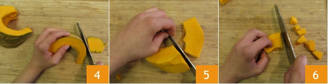 Enlevez la peau avec un couteau 4 et d'éventuelles graines ou filaments internes. Maintenant, coupez-le d'abord en tranches 5 puis en cubes 6.
