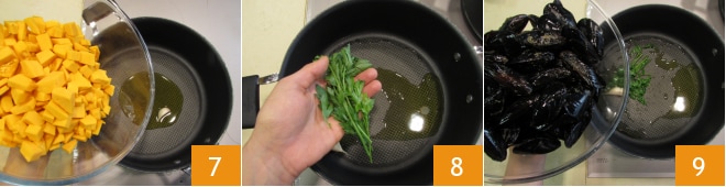 Faites dorer une gousse d'ail avec un filet d'huile dans une casserole, ajoutez le potiron 7 et laissez-le rissoler quelques minutes. Pendant ce temps, dans une autre casserole, mettez ail, huile et persil 8, faites également revenir cela, puis ajoutez les moules 9