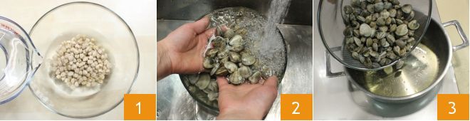Pour préparer la fregola aux palourdes et pois chiches, vous devrez faire réhydrater les pois chiches pendant au moins 12 heures (ou toute une nuit), dans un bol rempli d'eau 1. Ensuite, égouttez les pois chiches qui seront réhydratés après le trempage et faites-les cuire dans de l'eau salée jusqu'à ce qu'ils soient tendres (cela prendra environ deux heures) (alternativement, vous pouvez cuire les pois chiches encore secs avec du sel et du romarin dans un autocuiseur pendant environ 50 minutes). Occupez-vous des palourdes, rincez-les 2 puis laissez-les dans une passoire avec un bol en dessous sous un filet d'eau courante pendant environ 30 minutes pour éliminer le sable. Dans une cocotte, versez un filet d'huile et deux gousses d'ail, ajoutez les palourdes 3, couvrez avec le couvercle et laissez cuire jusqu'à ce qu'elles s'ouvrent.
