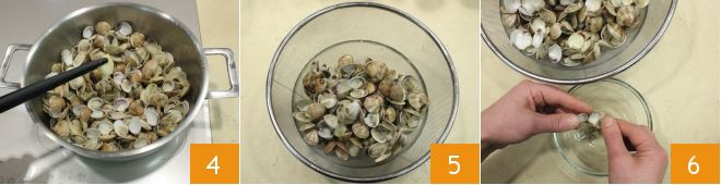 Une fois prêtes, retirez les gousses d'ail 4, égouttez-les 5 en prenant soin de conserver leur eau qui servira à cuire les palourdes. Décortiquez-les 6 en en gardant quelques-unes entières pour la garniture des plats.