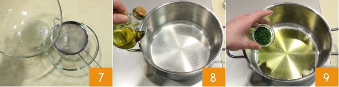 Filtrez l'eau de cuisson des palourdes que vous avez recueillie 7 et utilisez-la pour diluer le concentré de tomate. Maintenant, occupez-vous de la cuisson de la fregola, placez dans une cocotte chaude l'huile d'olive 8, ajoutez 2 gousses d'ail entières ou écrasées si vous préférez et une cuillère à soupe de persil haché 9.
