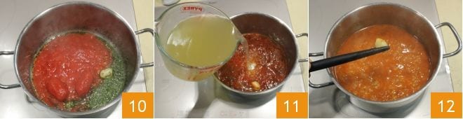 Ajoutez ensuite les tomates pelées 10 et le concentré de tomate dilué dans le liquide des palourdes, faites cuire pendant quelques minutes. Puis versez quelques louches de bouillon de légumes 11 pour le réaliser au mieux, suivez la recette du bouillon de légumes. Retirez l'ail avec une pince de cuisine 12