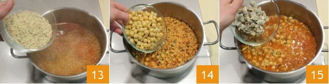 puis versez la fregola 13 qui devra cuire pendant environ 10-15 minutes. Continuez la cuisson en ajoutant peu à peu le bouillon. À mi-cuisson, ajoutez également les pois chiches 14. Une fois la cuisson terminée, ajoutez également les palourdes décortiquées et éteignez le feu 15.