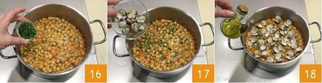 Ajustez le sel et le poivre, aromatisez avec une autre cuillère de persil haché 16, puis ajoutez également les palourdes avec leur coquille que vous avez mises de côté 17. Pour finir, assaisonnez avec un filet d'huile d'olive 18 Votre fregola aux palourdes et pois chiches est prête à être servie, dégustez-la bien chaude accompagnée de pain carasau.