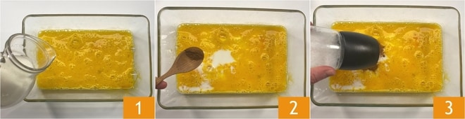 Pour préparer le pain perdu, commencez d'abord par battre les œufs dans un plat bas et large, ajoutez le lait 1, la cannelle 2 et une pincée de sel 3.