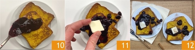 Une fois cuits, garnissez vos pains perdus directement sur les assiettes de service : nous avons utilisé de la confiture de myrtilles 10, un cube de beurre 11 et une pincée de cannelle. Votre pain perdu est prêt à être dégusté 12 !