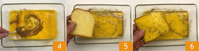 Battez le tout avec une fourchette 4. Trempez les tranches de brioche dans le mélange d'œufs et de lait 5, en les retournant rapidement des deux côtés 6.