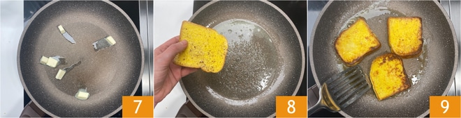 En attendant, faites fondre doucement le beurre dans une poêle 7. Lorsqu'il est fondu, déposez les tranches de brioche 8 et faites cuire pendant 2-3 minutes d'un côté et 2-3 minutes de l'autre, en les retournant avec une spatule 9. Lorsqu'elles sont dorées, transférez-les sur une assiette et continuez de cuire les tranches restantes, en prenant soin de faire fondre à chaque fois un autre morceau de beurre dans la poêle.