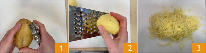 Pour préparer le frico aux pommes de terre et oignons, commencez par éplucher les pommes de terre 1, puis râpez-les à l'aide d'une râpe à gros trous 2. Mettez-les de côté pour le moment 3.
