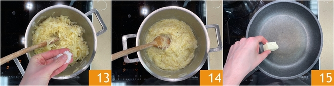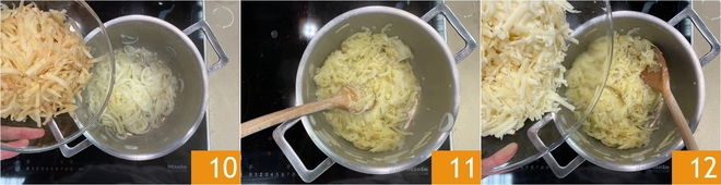 Laissez-les compoter pendant environ 15 minutes, en remuant souvent avec une cuillère en bois pour éviter qu'elles n'attachent ou ne brunissent trop. Lorsqu'elles seront tendres, ajoutez les pommes de terre râpées 10 et poursuivez la cuisson environ 10 minutes à feu moyen-doux, en remuant de temps en temps 11. Ajoutez ensuite le fromage râpé 12.