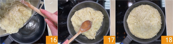 Versez le mélange dans la poêle 16 en éliminant, si nécessaire, l'éventuel excès de graisse. Répartissez-le de manière uniforme et tassez légèrement avec le dos d'une cuillère, en lissant la surface 17. Couvrez et faites cuire à feu moyen-vif sans remuer, comme une omelette, jusqu'à la formation d'une croûte dorée. Cela prendra environ 15 minutes.