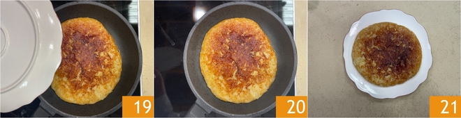 Retirez ensuite la poêle du feu et laissez tiédir un instant, puis retournez le frico à l'aide d'une assiette 19 ou d'un couvercle. Remettez-le sur le feu et faites cuire l'autre face environ 10 minutes, jusqu'à obtenir une coloration uniforme 20. Laissez enfin tiédir légèrement avant de le transférer sur un plat de service 21. Attendez une ou deux minutes et servez le frico aux pommes de terre et oignons encore chaud !