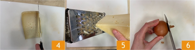 Passez au fromage : retirez la croûte du Montasio 4 et râpez-le lui aussi avec une râpe à gros trous 5, afin qu'il puisse fondre uniformément pendant la cuisson. À présent, occupez-vous des oignons : commencez par les éplucher 6.