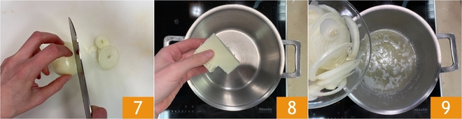 Coupez-les en fines rondelles 7. Dans une sauteuse de grande taille, faites fondre 30 g de beurre à feu doux 8, puis ajoutez les oignons 9.