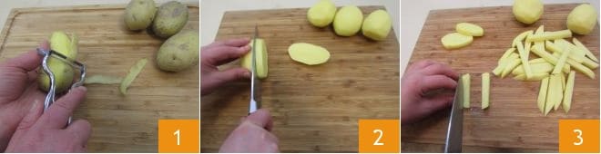 Commencez la préparation des frites en pelant les pommes de terre 1 (vous pouvez utiliser des pommes de terre à chair jaune ou celles que vous préférez en évitant si possible les rouges qui, ayant peu d'humidité, sont peu indiquées), puis coupez-les : d'abord en tranches épaisses d'environ 1 cm 2 puis en forme de gros allumettes d'environ 1 cm d'épaisseur 3.