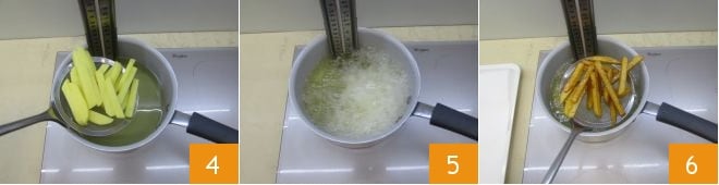 Mettez l'huile à chauffer dans une casserole et lorsqu'elle aura atteint la température de 170° (vous pouvez utiliser un thermomètre de cuisine pour mesurer la température exacte), plongez quelques frites à la fois 4. Attendez environ 5 minutes 5 et lorsqu'elles seront bien dorées, utilisez une écumoire pour les égoutter de l'huile 6