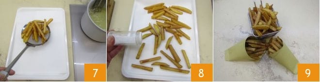et transférez-les sur un plateau recouvert de papier absorbant 7, afin d'éliminer l'excès d'huile. Continuez à frire les frites et au fur et à mesure, salez-les 8. Servez les frites encore fumantes et croustillantes 9, car plus vous attendez, plus elles auront tendance à ramollir.