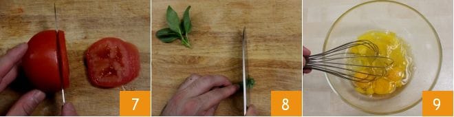 Passez à l'autre tomate : retirez le pédoncule et coupez la tomate en tranches 7 que vous garderez de côté pour la décoration. Émincez ensuite le bouquet de basilic frais 8 que vous ajouterez ensuite à l'omelette. Dans un bol, cassez les œufs, salez et poivrez à votre goût, puis commencez à les battre avec un fouet 9.