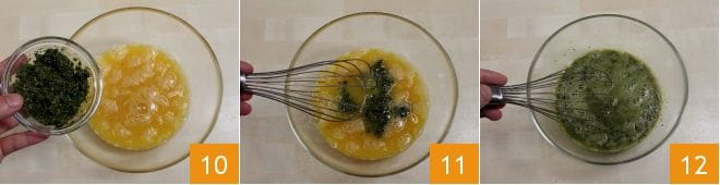 Après avoir battu les œufs pendant quelques secondes, incorporez le pesto que vous aviez mis de côté 10 et mélangez avec le fouet 11 pour obtenir un mélange homogène 12.