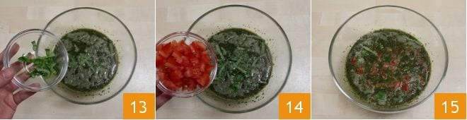 Ajoutez ensuite aussi le basilic émietté 13 et la chair de tomates en dés que vous aviez mise de côté 14. Mélangez à nouveau le tout 15.